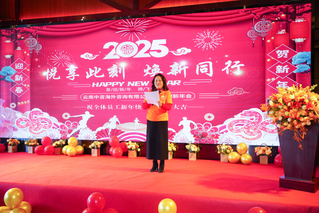 年會開始,亢麗毓董事長代表公司董事會向所有來賓和全體云南中咨海外的同仁及家人,表示最衷心的感謝和最誠摯的新年祝福??蝴愗苟麻L帶領(lǐng)大家回顧2024年過往,這一年,我們從低谷中奮進(jìn),我們用堅韌超越自我,用汗水鑄就成功,用優(yōu)質(zhì)的服務(wù)贏得了客戶的信賴和好評。
