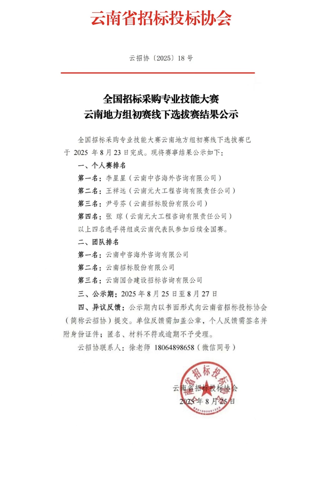 喜報?? 全國招標(biāo)采購專業(yè)技能大賽云南地方組初賽結(jié)果出爐,我司團隊賽第一 + 個人賽第一 ,雙冠加冕!